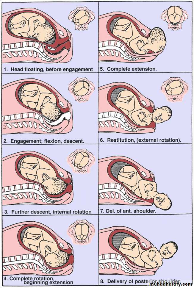 In order to be delivered,the shoulders have to rotate into direct anterior-posterior plane.When this occurs,the occiput rotate through a further one-eighth of a circle to the transverse position.