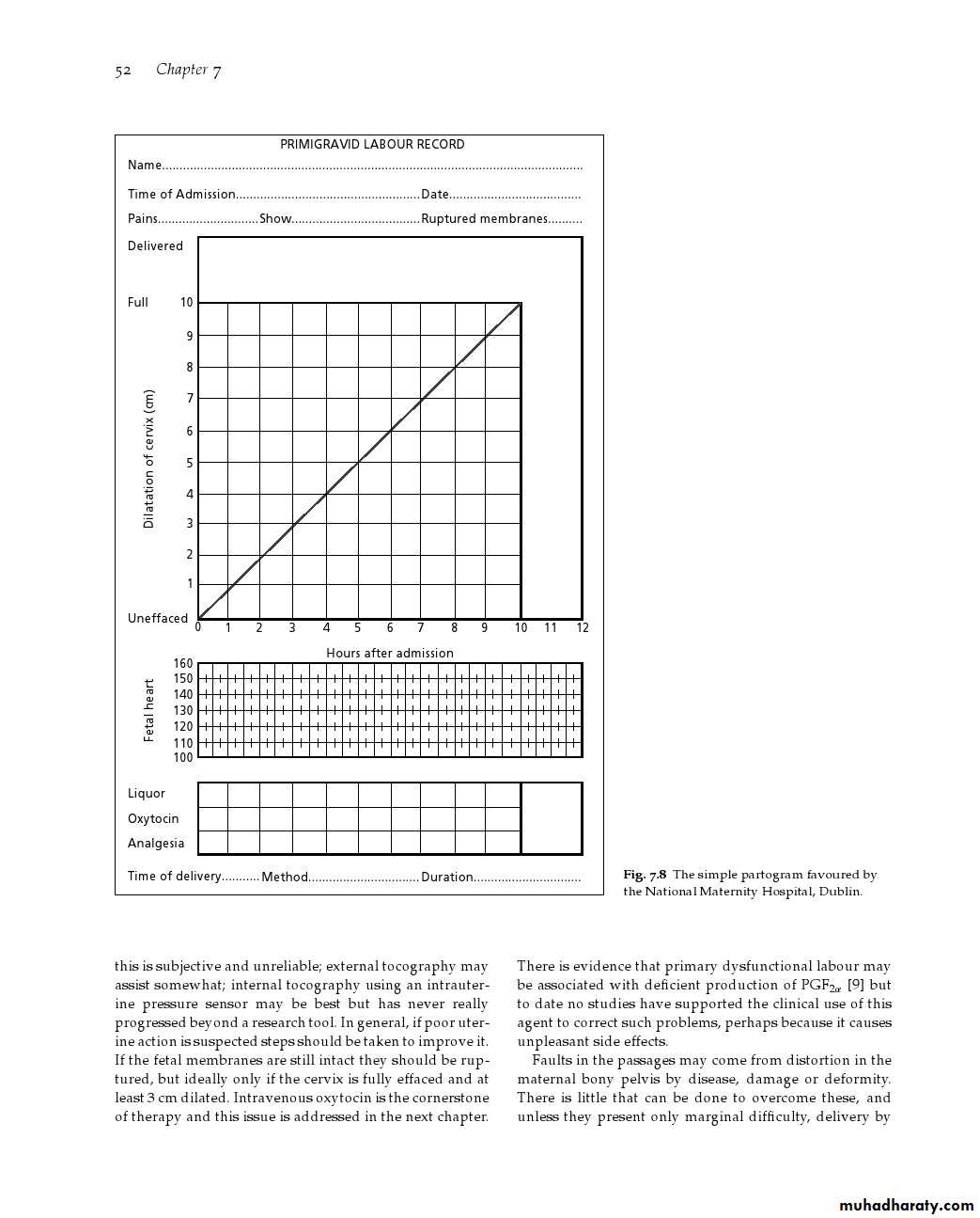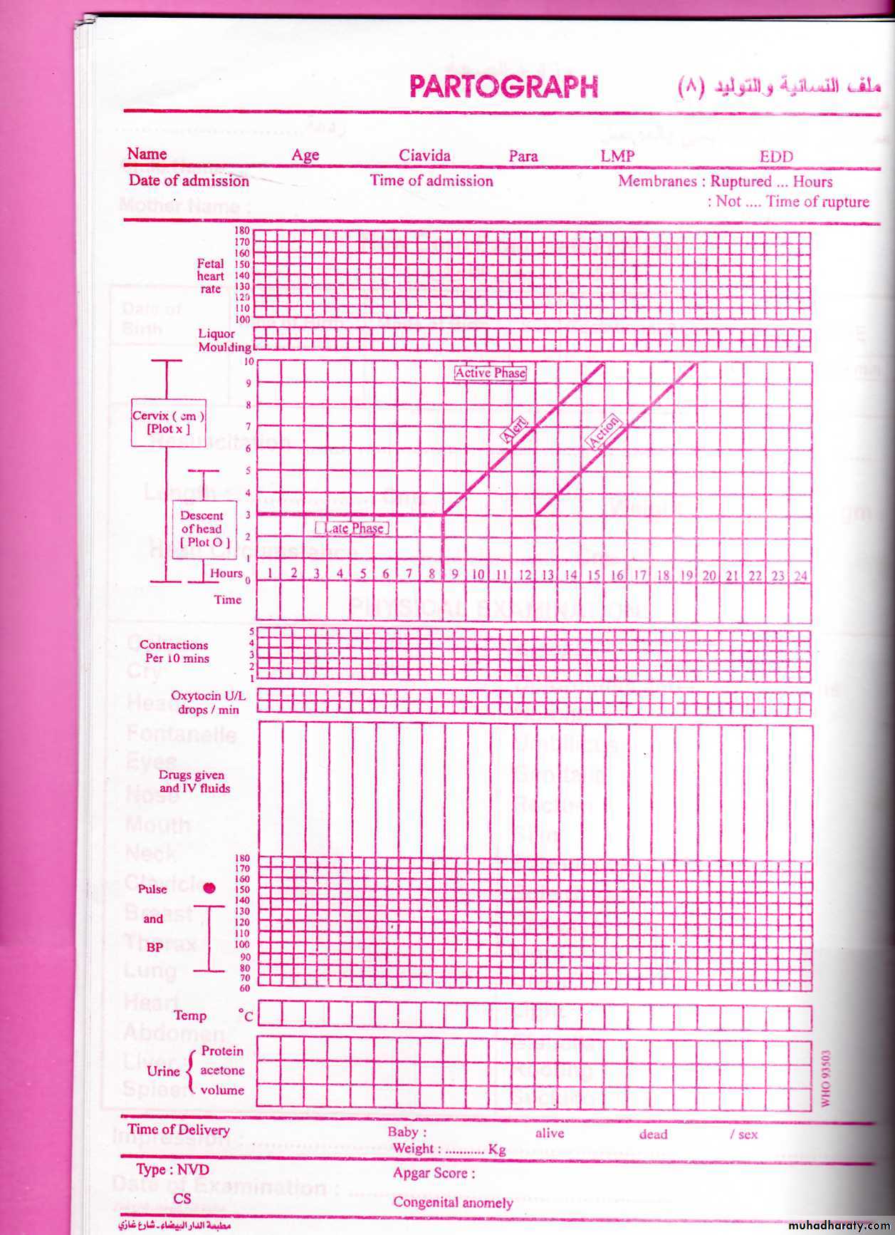 This record allows visual assessment of mother pulse rate&blood pressure,srength &frequency of uterine contraction.Cervical dilatation in centimeters against the time in hours plotted against expected normal so compaired to an average curve for normal primegravidae or multigravidae as may be appropriate in any given population.