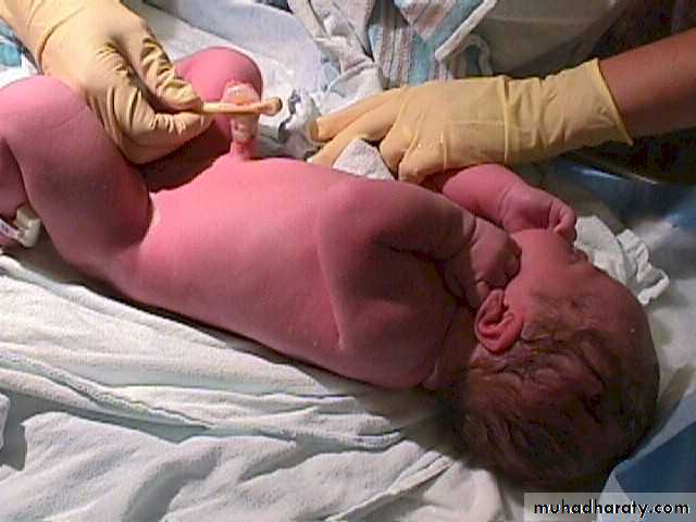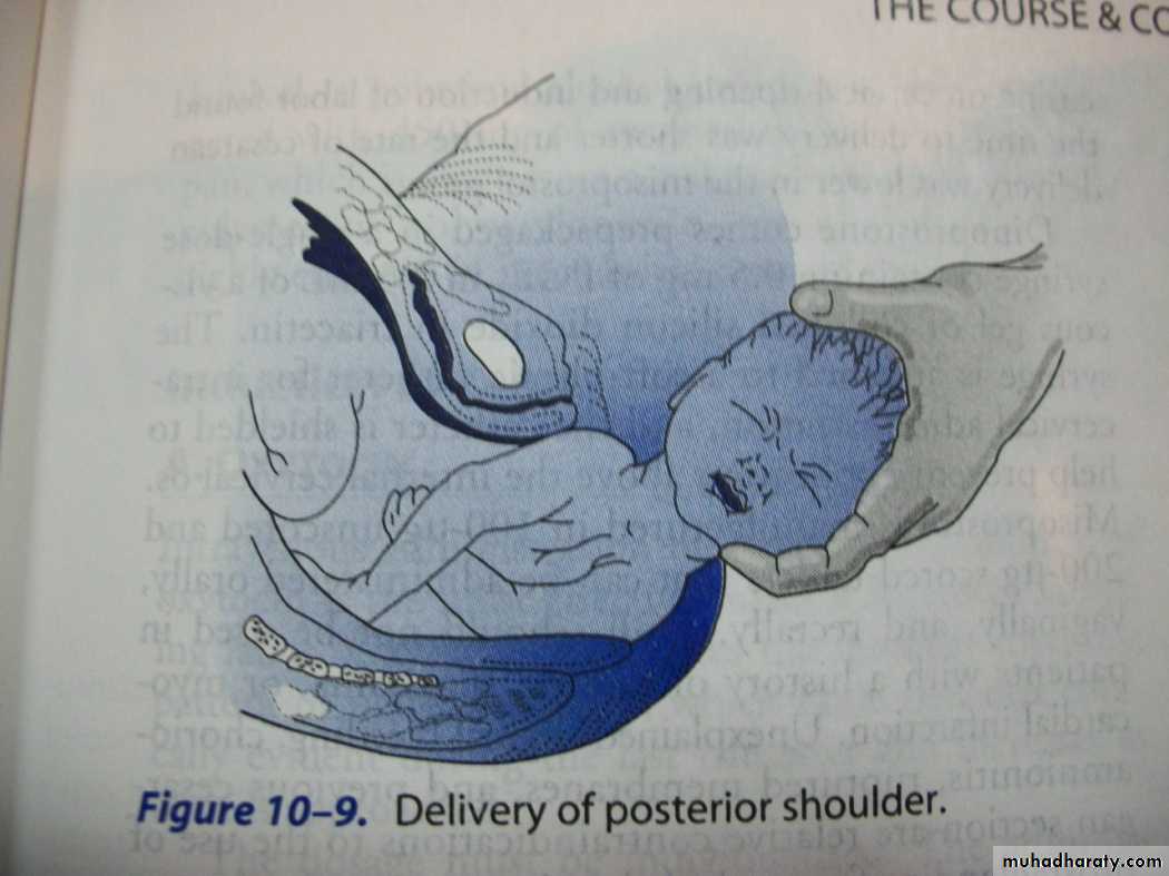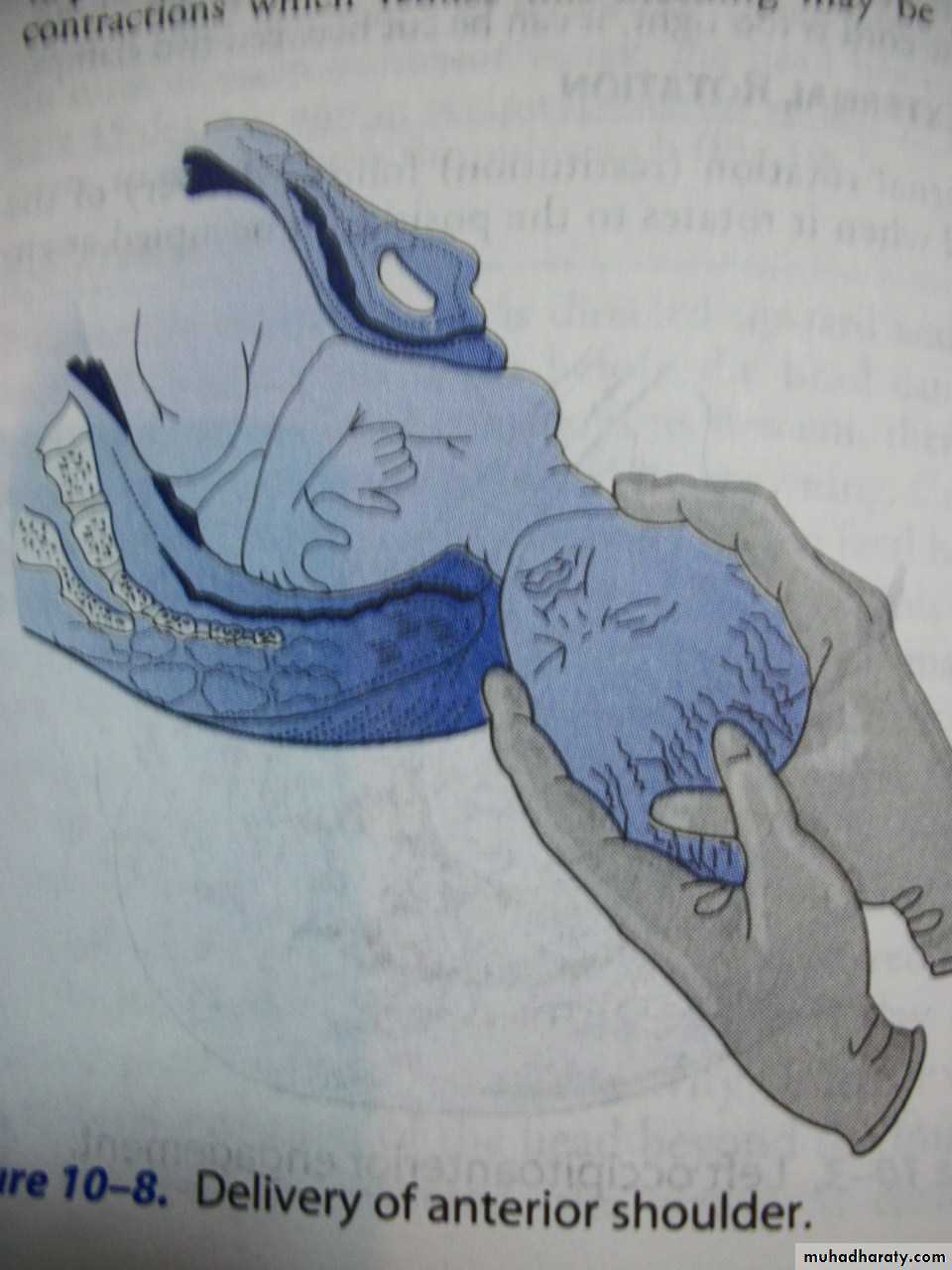 • Once the head is born, cheking the neck [if there is loops of umbilical cord are found]to slip the cord over the head;nasopharyngeal suction is performed• .With the next contraction there is external rotation of the head &delivery of shoulders ,to aid it the head is pulled gently downwards&forwards until the anterior shoulder appears beneath the pubis.