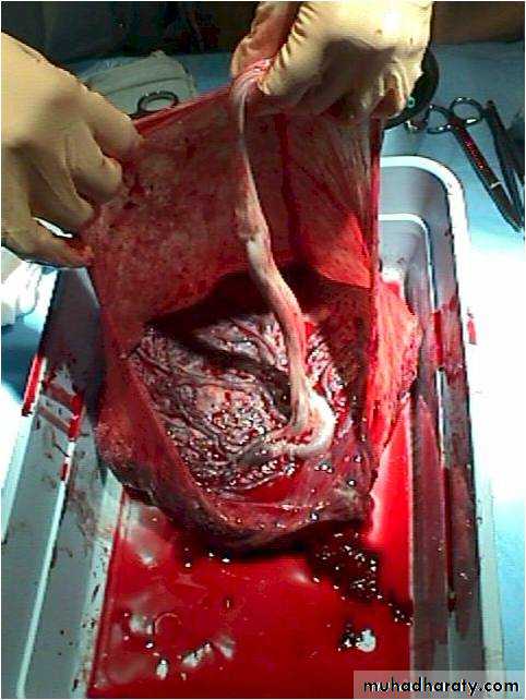 • 3-When a contraction is felt the left hand should be moved suprapubically &the fundus is elevated with the palm facing towards the mother.At the same time the right hand should grasp the cord &exert steady tractionso that the placenta separates &delivered gently ,care being taken to peel off all membranes ususlly with a twisting motion.