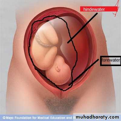 The uterine contraction&dilatation of internal os cause separation of chorion from decidua closest to it thus a small back of membranes is formed into the internal os,the head then comes down separates liquor amnii which is above it from that in the back called respectively the hind&fore waters.When membranes ruptured the fetal axis pressure comes into play ;the upper pole of fetus is pressed on by the fundus of the uterusNormal first stage should not exceed 12 hours in a primegravida &8 hours in multipara.