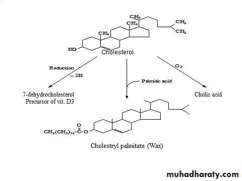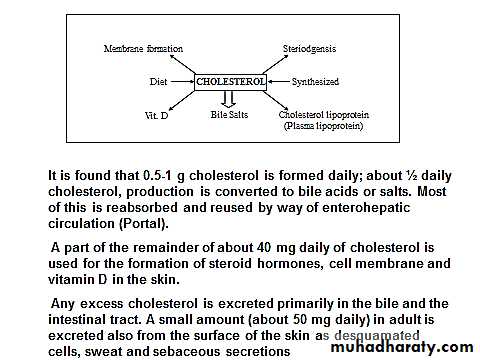 Cholesterol is the most important compound of those classified as sterols. Cholesterol is a precursor of bile salts, steroid hormones, and vitamin D.Dietary sources of cholesterol amounting between 500-750 mg daily in the adults, which are in the form of animal products (meat, livers, eggs and milk lipids).