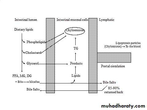 This is the mechanism for lipids products in which they passes to the intestinal mucosal cells where the uncompleted lipids digestion is completed and 85-90% of the bile will return back through the portal circulation to the liver.