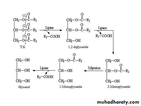 Lipase acts specifically on ester linkage No.1& No.3, while No.2 is slowly hydrolyzed. Migration of fatty Acyl residue from position 2 to position 1 is usually occurring before hydrolysis.