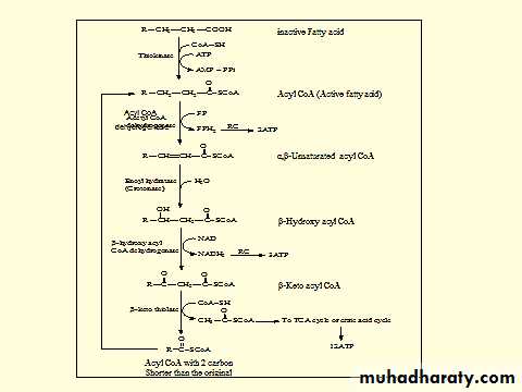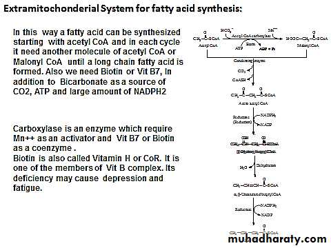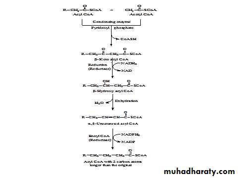 malonylCoA and the process is repeated for a total of 7 times palmitylCoA and then palmitic acid is the major end product.Summary: