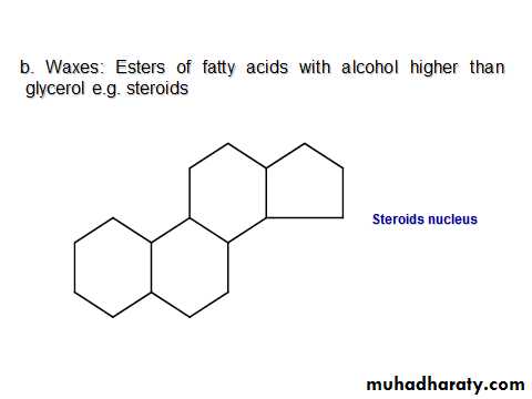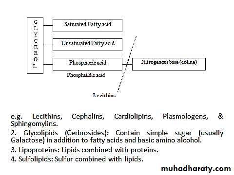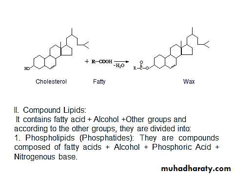 Fatty acidI. Simple lipids: They are esters of fatty acids and one of the various alcohols. They are divided into: