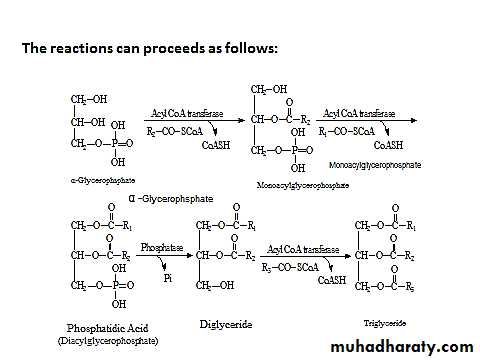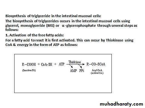 In the intestinal mucosal cells, resynthesis of triacyl glycerol (Triglyceride) will occur using glycerol or acylglycerol & the free fatty acids.