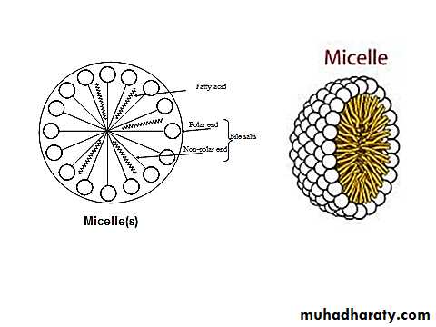 This happen by combination with bile salts forming micelles in which the outer ends are the Polar parts and the non-polar ends are to the inside of the micelles , in between them the products of fat hydrolysis usually situated.