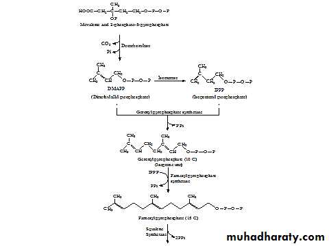 Condensation of 6 isoprenoid units to give squalene (30 carbon atoms )