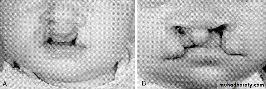 • Mesenchymal deficiency causing partial or complete failure of medial nasal prominences to merge and form the intermaxillary segment