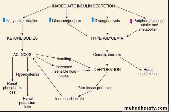 T1DM is a progressive low insulin catabolic state in which feeding does not reverse, but rather exaggerates, these catabolic processes.With moderate insulinopenia, glucose utilization by muscle and fat decreases and postprandial hyperglycemia appears