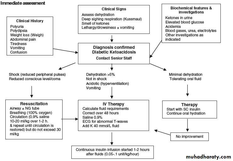 TREATMENTTreatment can be divided according to type of presentation , whether present with classical signs and symptoms of T1D (polyuria,polydipsia.weight loss and others) which requires starting insulin only, or present with DKA which need to start a special protocol for treatment.