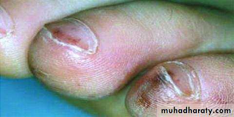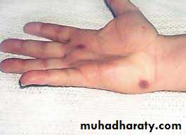 • Janeway lesions (small, erythematous or hemorrhagic, macular nontender lesions on the palms and soles). Named after Edward Janeway (1841=1911) They are caused by septic emboli which deposit bacteria, forming micro-abscesses of the dermis with marked necrosis and inflammatory infiltrate not involving the epidermis.