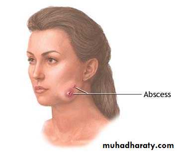 Abscesses show dense, almost solid masses of neutrophils (pus cells) often inter- mixed with inflammatory exudate, cellular debris, necrotic material, bacterial colonies.Inflammatory cells infileterate , cellular debris with necrotic materials , ect.