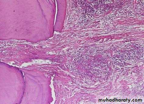 With progression, slight widening of PDL, lamina dura may become less defined.Histopathological features: