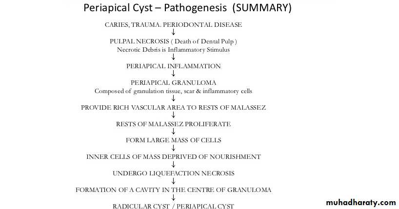 • Proliferation of epithelial rests of Malassez and formation of a radicular cyst.