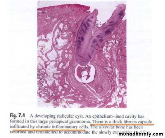 in most cases is identical to periapical granuloma,but, the cyst may be of greater size than the granuloma.Occasionally the apical periodontal cyst exhibits a thin, radiopaque line around the periphery of the radiolucent area, and this indicates a reaction of the bone to the slowly expanding mass.