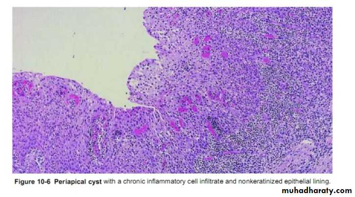 Histological Features.The epithelium lining the apical periodontal cyst is usually stratified squamous in type .