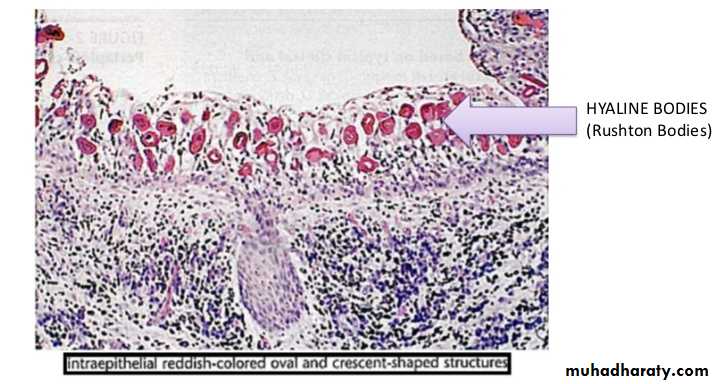 Hyaline bodies may be seen in the epithelium and mucous cells are often present as a result of metaplasia.