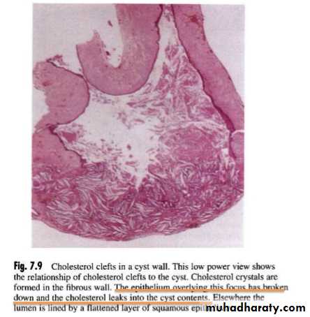 Within the cyst capsule there are often areas split up by fine needle-shaped clefts.These are left by cholesterol dissolved-out during preparation for sectioning.The cholesterol is derived from breakdown of blood cells.
