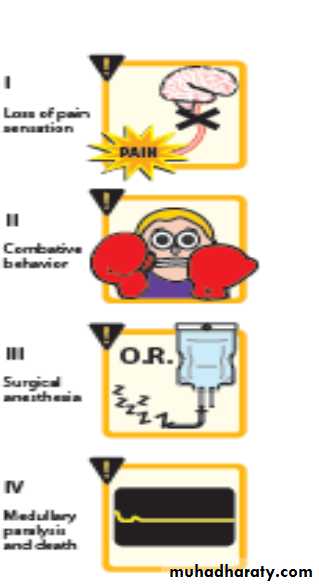 1. Stage I—Analgesia: Loss of pain sensation results from interference with sensory transmission in the spinothalamic tract. The patient progresses from conscious and conversational to drowsy. Amnesia and reduced awareness of pain occur as Stage II is approached.
