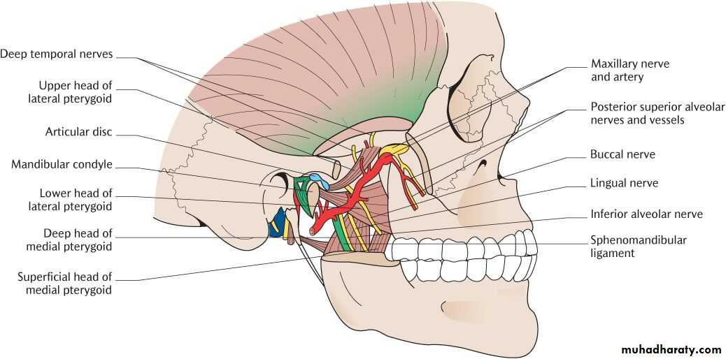 1. Muscles of mastication ( masseter and most of temporalis lie outside of infratemporal fossa)• Lower portion of temporalis muscle: passes medial to zygomatic arch to insert on coronoid process and anterior border of ramus of mandible
