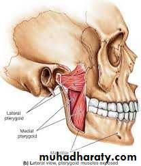 • Lateral pterygoid muscle: from lateral pterygoid plate and greater wing of sphenoid to neck of mandible and articular disc of TMJ