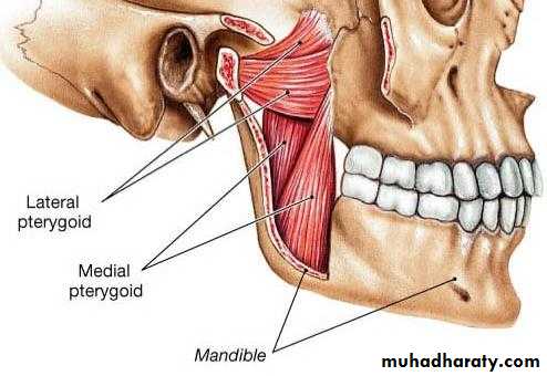 • Medial pteryygoid muscle: from medial surface lateral pterygoid plate and tuberosity of maxilla to medial surface of ramus and angle of mandible .