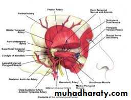 Temporalis muscle , deep temporal nerves and vessels , auriculotemporal nerve , superficial temporal vessels8