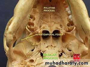 • Pterygomaxillary fissure: medial cleft leading into pterygopalatine fossa; for terminal part of maxillary artery .