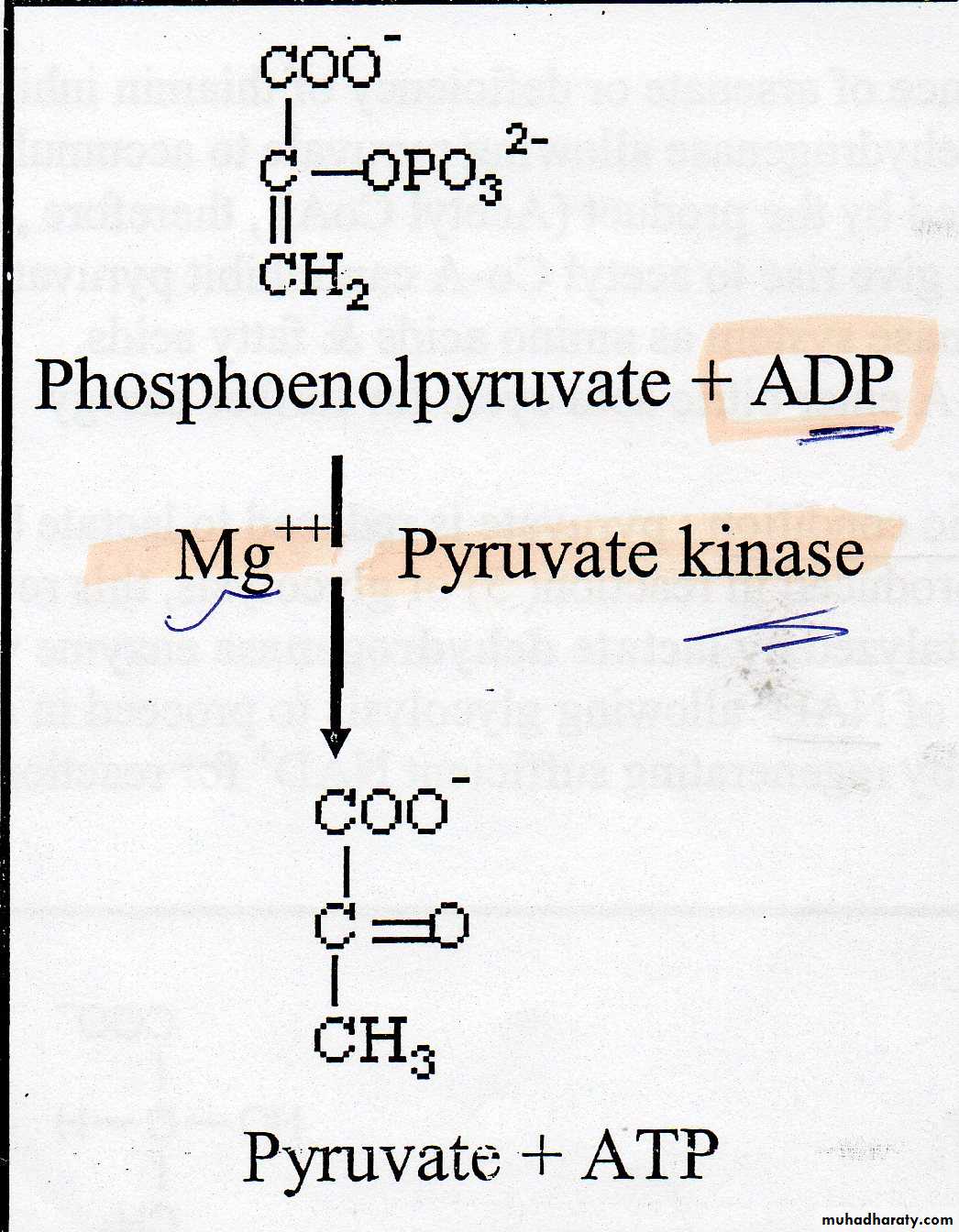 This is the final reaction in glycolysis,phosphate group of phosphoenolpyruvate is transferred to ADP forming ATP while phosphoenolpyruvate is converted to enolpyruvate which undergoes spontaneous non enzymatic isomerization to pyruvate.at this stage two molecules of ATP are produced per molecule of glucose .this is irreversible reaction catalyzed by pyruvate kinase in the presence of Mg˖²Fate of pyruvate