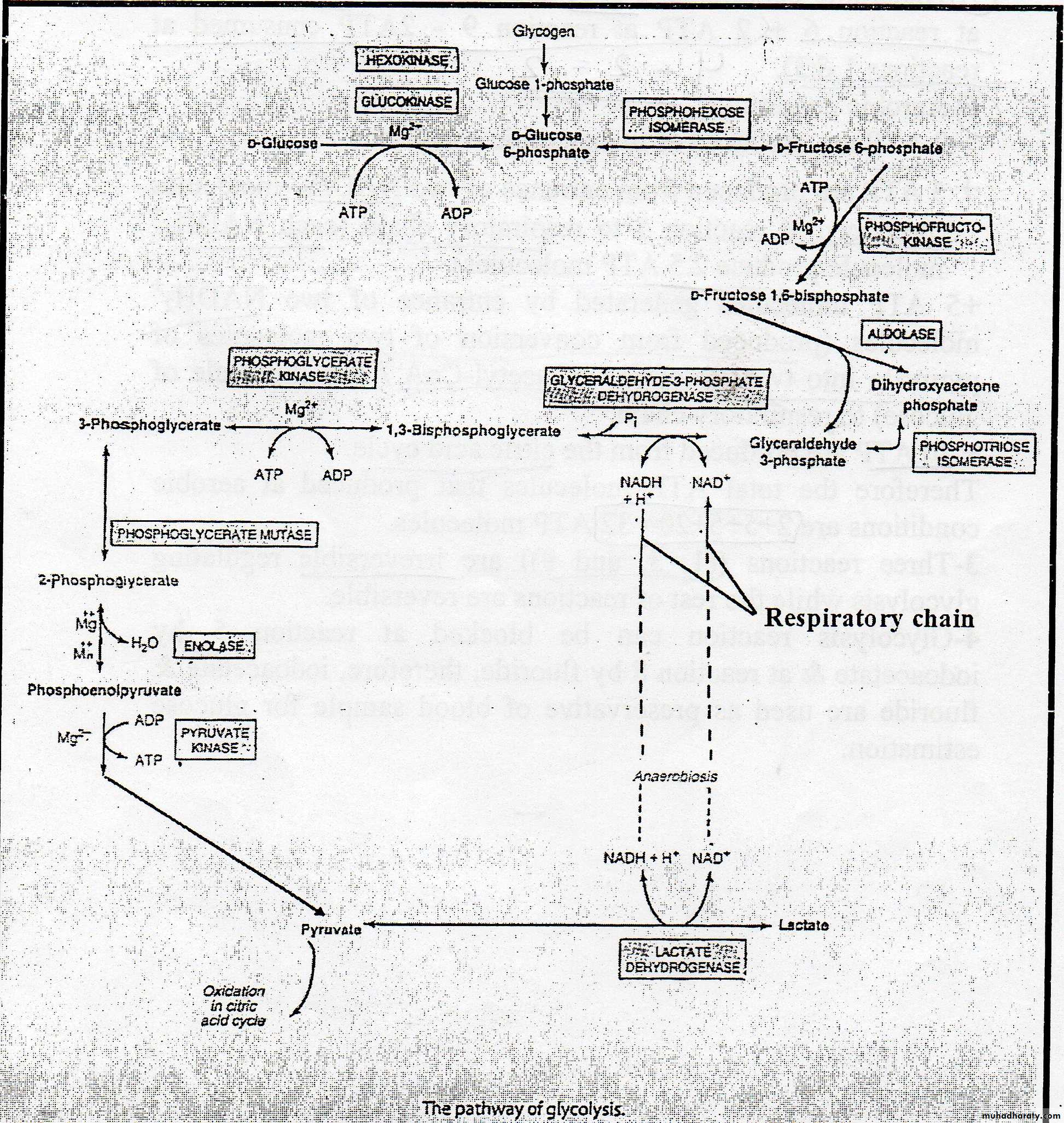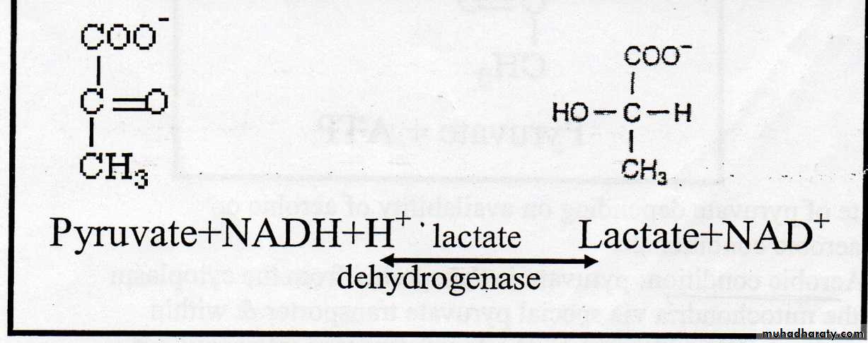 2.Anaerobic condition:pyruvate is reduced to lactate by NADH˖² produced in reaction 5 ,this reversible reaction catalyzed by lactate dehydrogenase with production of NAD˖ allowing glycolysis to proceed in anaerobic condition by regenerating sufficient NAD˖ for reaction 5 to continue.