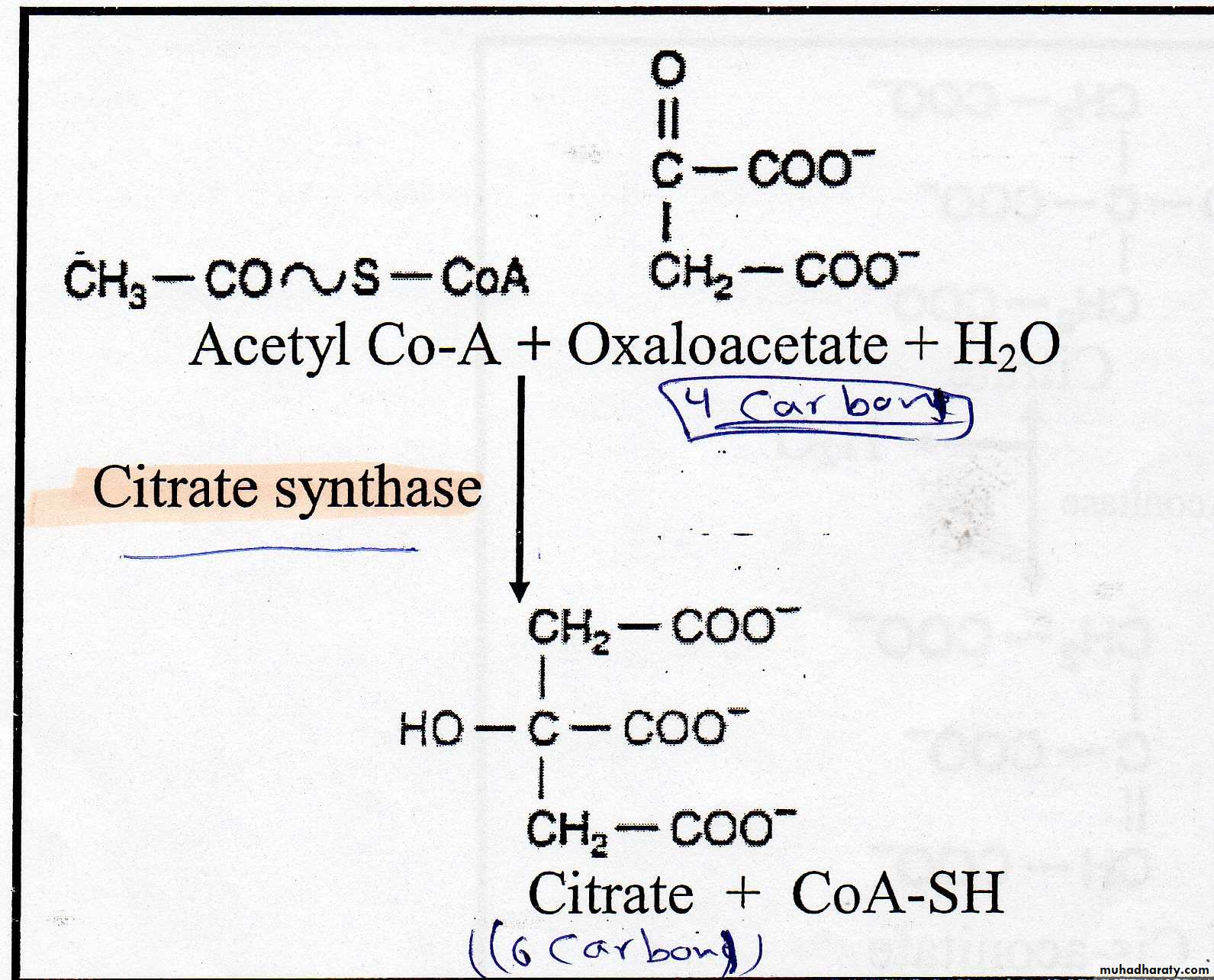 Condensation of acetyl CoA and oxaloacetate to form citrate and release of CoA –SH this irreversible reaction is catalyzed by citrate synthase .Reaction 2
