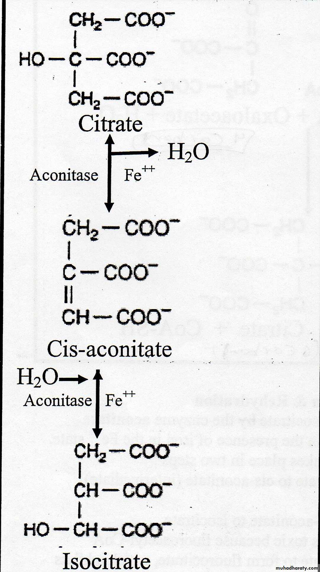 Citrate is isomerized to isocitrate by the enzyme aconitase in the presence of iron in ferrous state. this reversible reaction takes place in two steps dehydration of citrate to cis aconitate and rehydration of cis aconitate to isocitrate.The poison fluoroacetate is toxic because fluoroacetyl CoA condenses with oxaloacetate to form fluorocitratae that inhibits aconitase ,causing citrate to accomulate.
