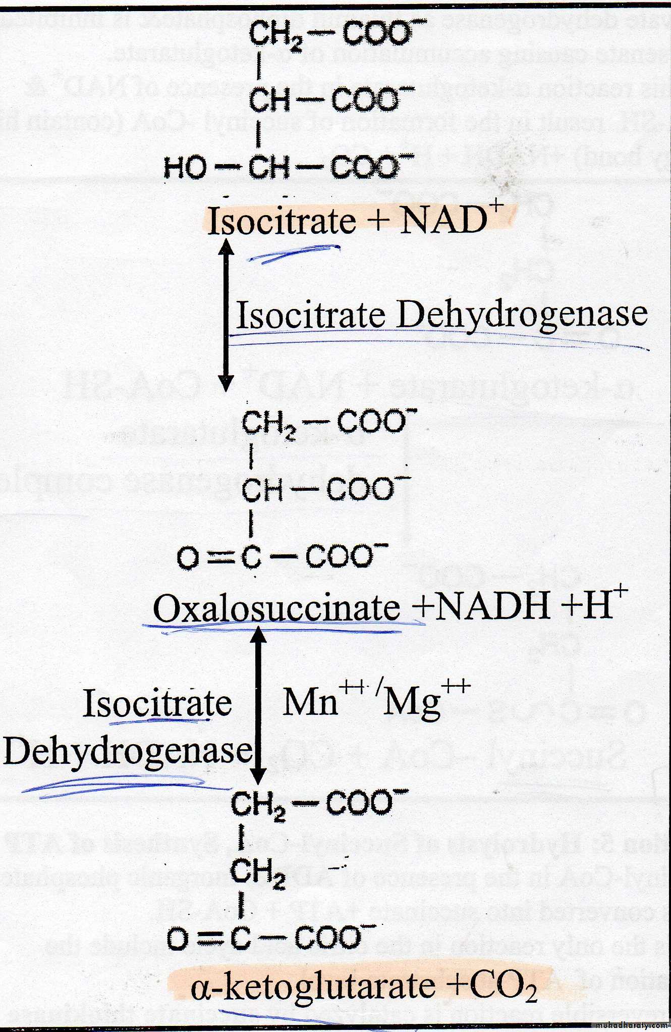 Isocitrate in the presence of NAD˖ is converted to α ketoglutarate ,although this reaction is reversible it is directed more toward the right and is catalyzed by isocitrate dehydrogenase in two steps.dehydrogenation in the presence of NAD˖ to oxalosuccinate (intermediate)+NADH+HDecarboxylation of oxalosuccinate to αketoglutarate and CO2,in the presence of Mn˖² or Mg˖²