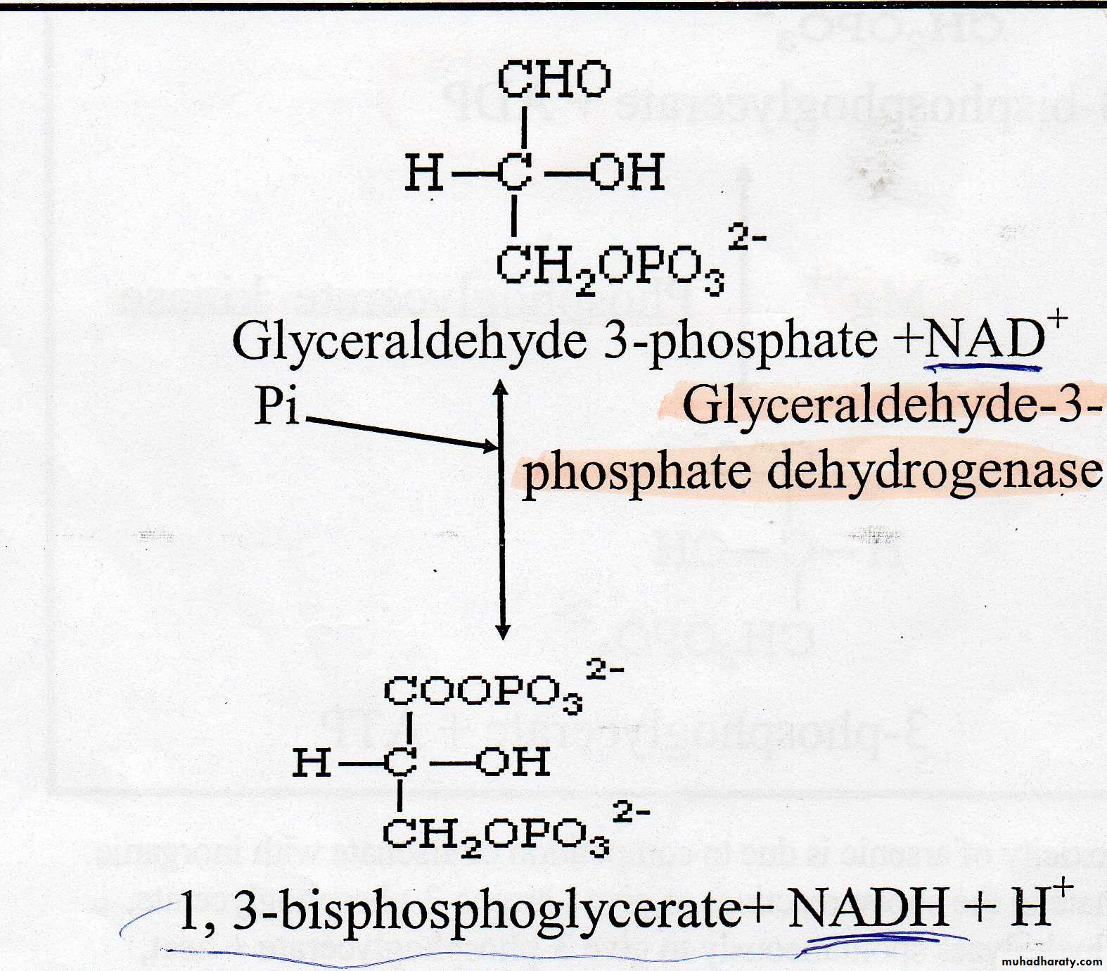 It is a reversible reaction is first an oxidation involving the coenzyme NAD˖ ,glyceraldehyde 3 phosphate is oxidized to an intermediate acid through the conversion of NAD˖ to NADH + H˖. then an inorganic phosphate (pi)is added in a phosphate ester synthesis to form1,3 bisphosphoglycerate.this and all the remaining reactions occur twice for each glu 6 phosphate (6 carbon),since there are now two molecules of 3 carbon each.This reaction is catalyzed by glyceraldehyde 3 phosphate dehydrogenase which is atetramer containing SH groups, therefore, may be inhibited by SH poison like iodoacetate which stop glycolysis.so ,iodoacetate is used as prservative of blood sample to prevent in vitro glycolysis.