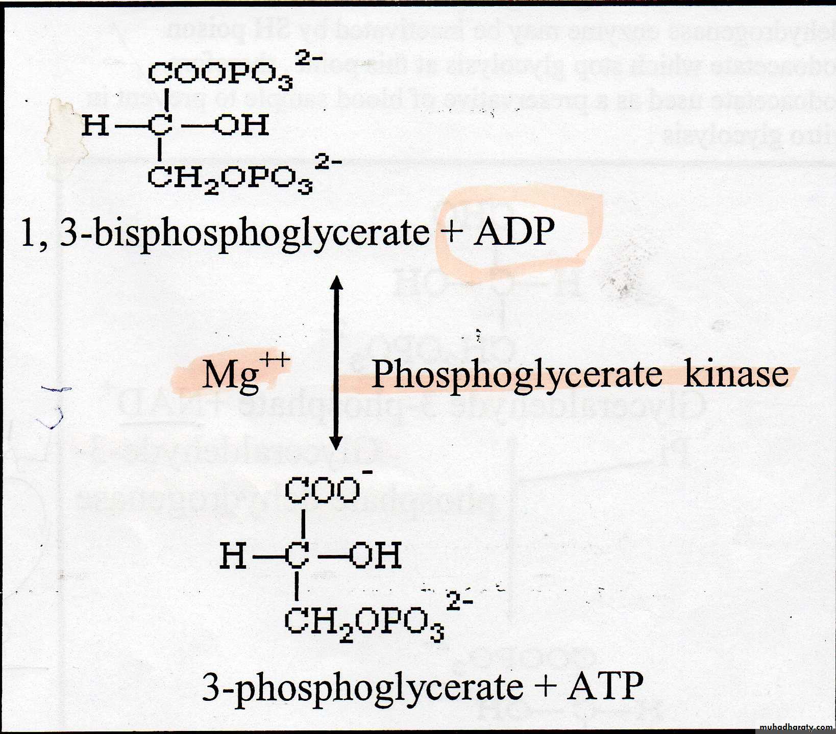 One of the phosphate groups of 1,3 bisphosphoglycerate undergoes hydrolysis to form 3- phosphoglycerate and phosphate ion is transferred directly to an ADP to make ATP,therefore ,at this stage two molecules of ATP are produced per molecule of glucose ,this is reversible reaction and catalyzed by phosphoglycerate kinase in presence of Mg ion.