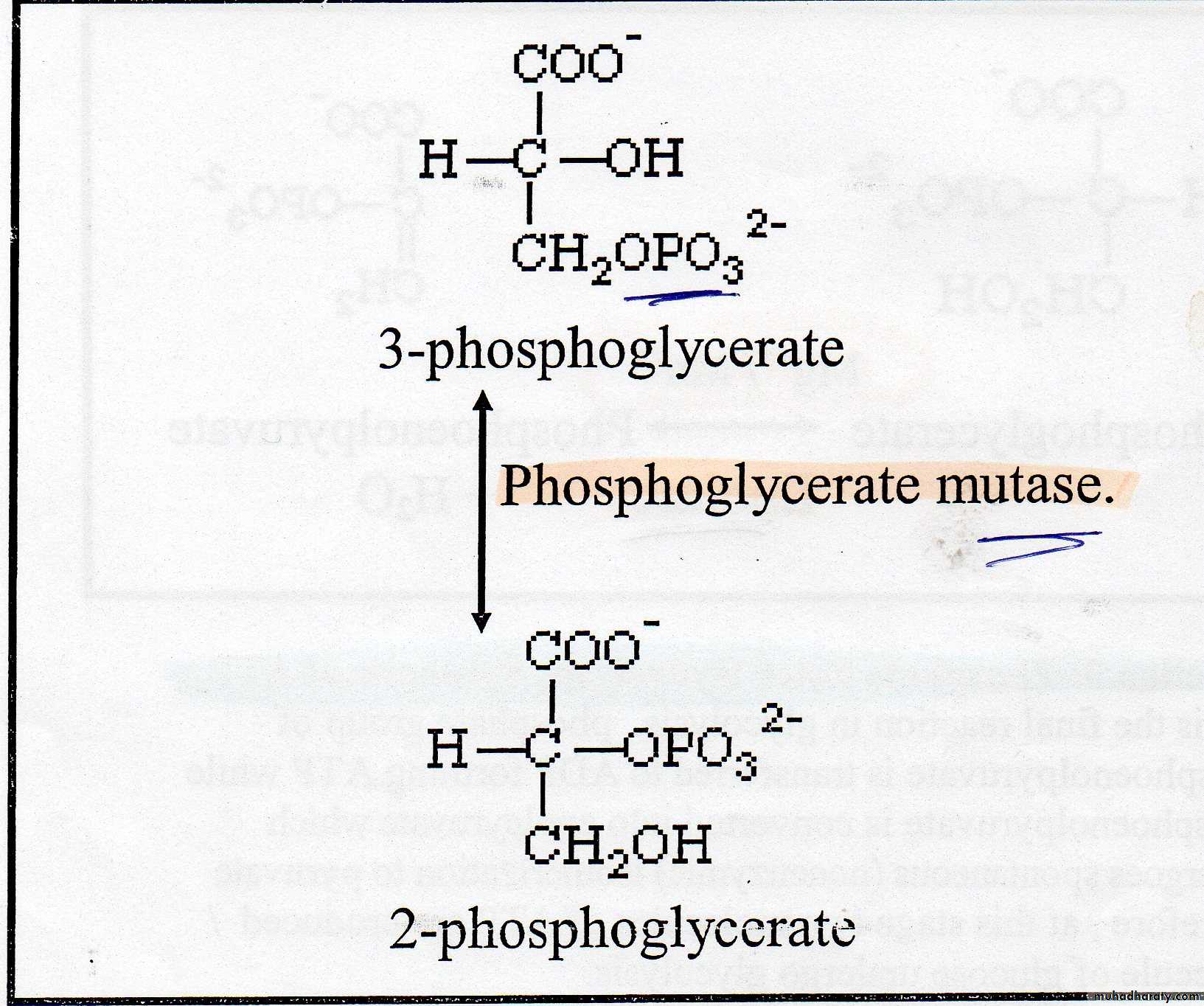 In this reaction the phosphate group moves from position 3 to position 2 of 3-phosphoglycerate producing 2- phosphoglycerate.It is reversible reaction and catalyzed by phosphoglycerate mutase enzyme.