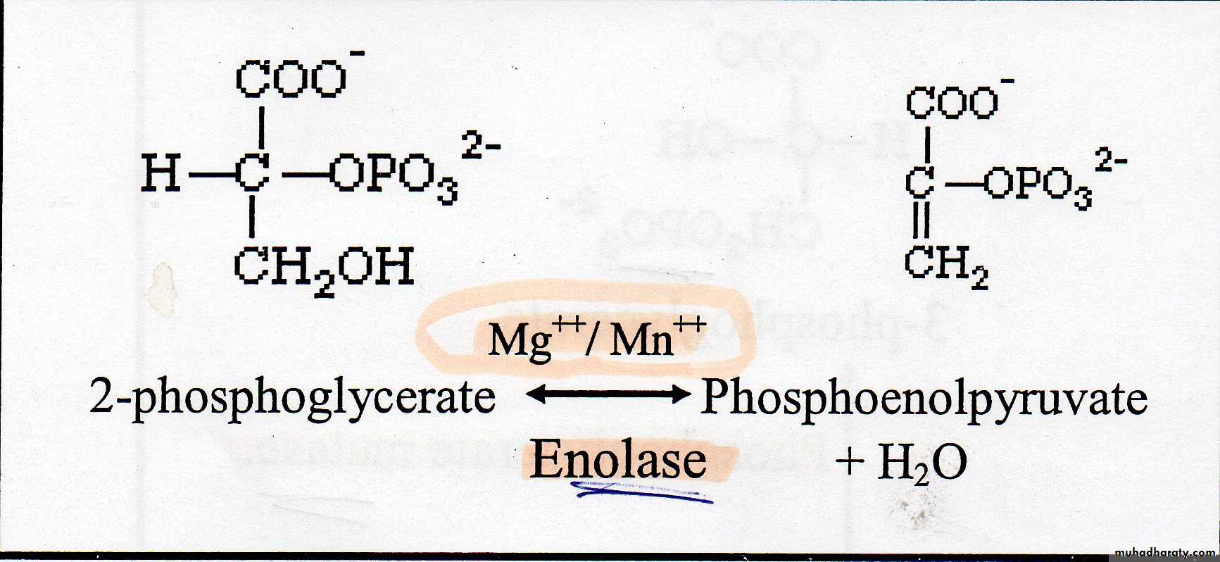 Dehydration of 2 phosphoglycerate forming phosphoenolpyruvate,this reversible reaction is catalyzed by enolase which is dependent on presence of either Mg ˖² or Mn˖² and inhibited by fluoride which is used as a preservative in vitro in estimation of blood glucose.Step 9 phosphate ester hydrolysis