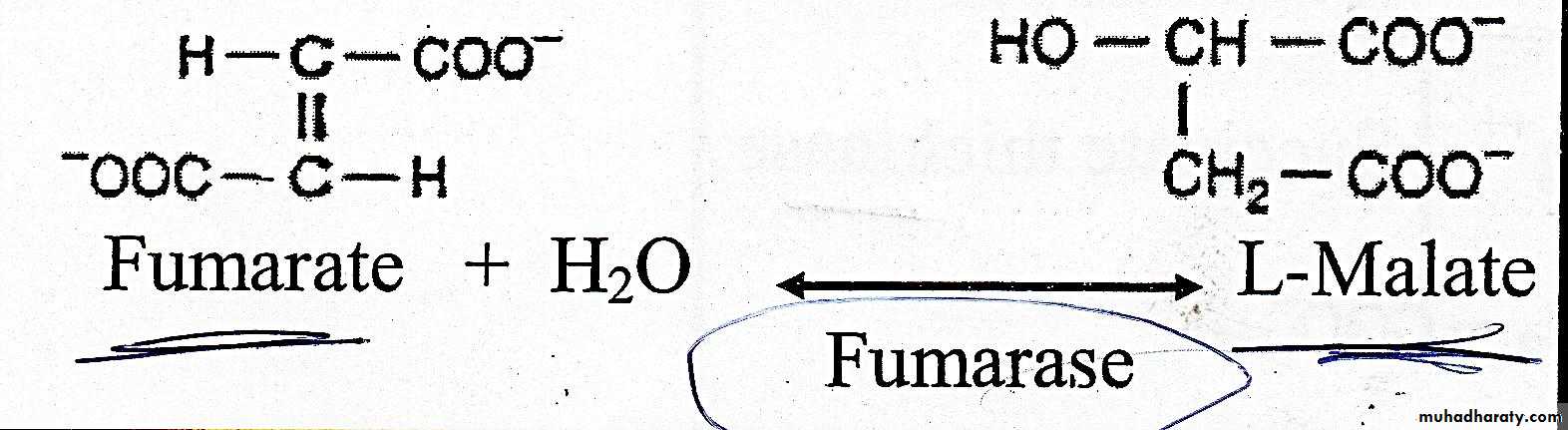 Hydration of the double bond of fumerate to form L-malate .this reversible reaction is catalyzed by fumerase (fumerate hydratase)Reaction 8