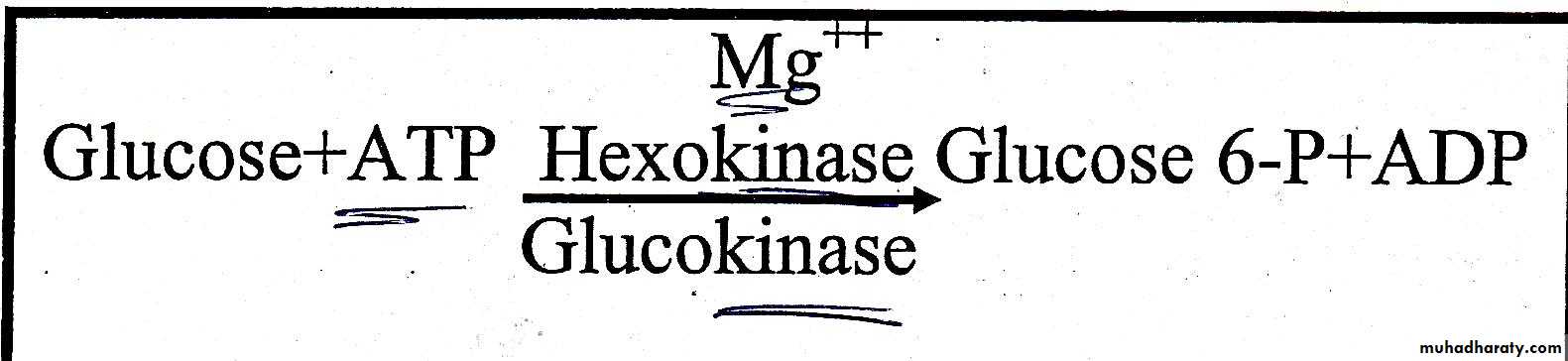 Glucose is phosphorylated to glucose 6 phosphate in irreversible reaction catalyzed by hexokinase in muscle and glucokinase in liver in the presence of Mg˖˖.