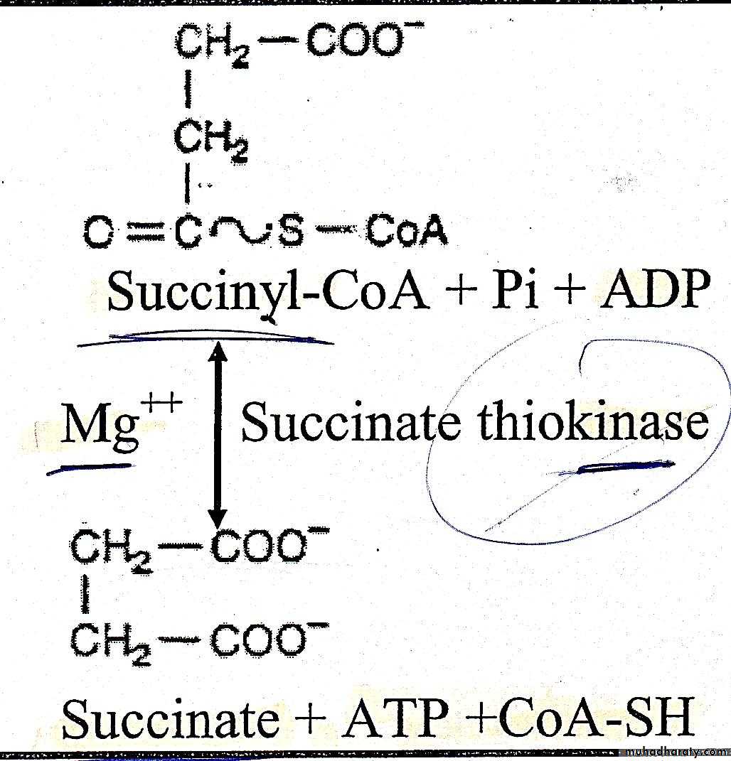 Succinyl Co A in the presence of ADP and inorganic phosphate is converted into succinate +ATP+CO A SH. this is the only reaction in citric acid cycle include the generation of ATP at substrate level. this reversible reaction is catalyzed by succinate thiokinase in the presence of Mg˖˖.succinate thiokinase also share in gluconeogenesis.6 dehydrogenation