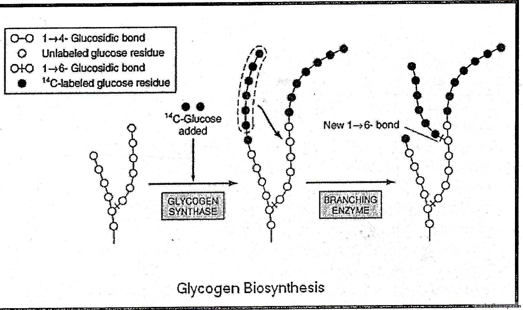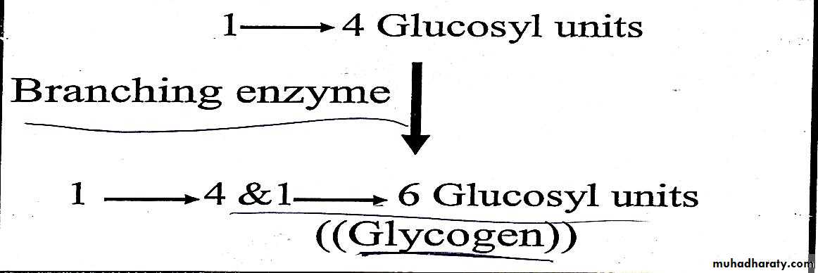 In reaction 4 the branches of glycogen tree become elongated as successive 1→4 linkages are added and when the chain becomes at least 11 glucose residue a second enzyme called branching enzyme transfer a part of 1,4 chain (minimum of 6 glucose residue) to a neighboring chain to form 1,6 linkage thus establishing a branch point in the molecule then the branches grow by further addition of 1→4 glycosyl units .this reaction is reversible.