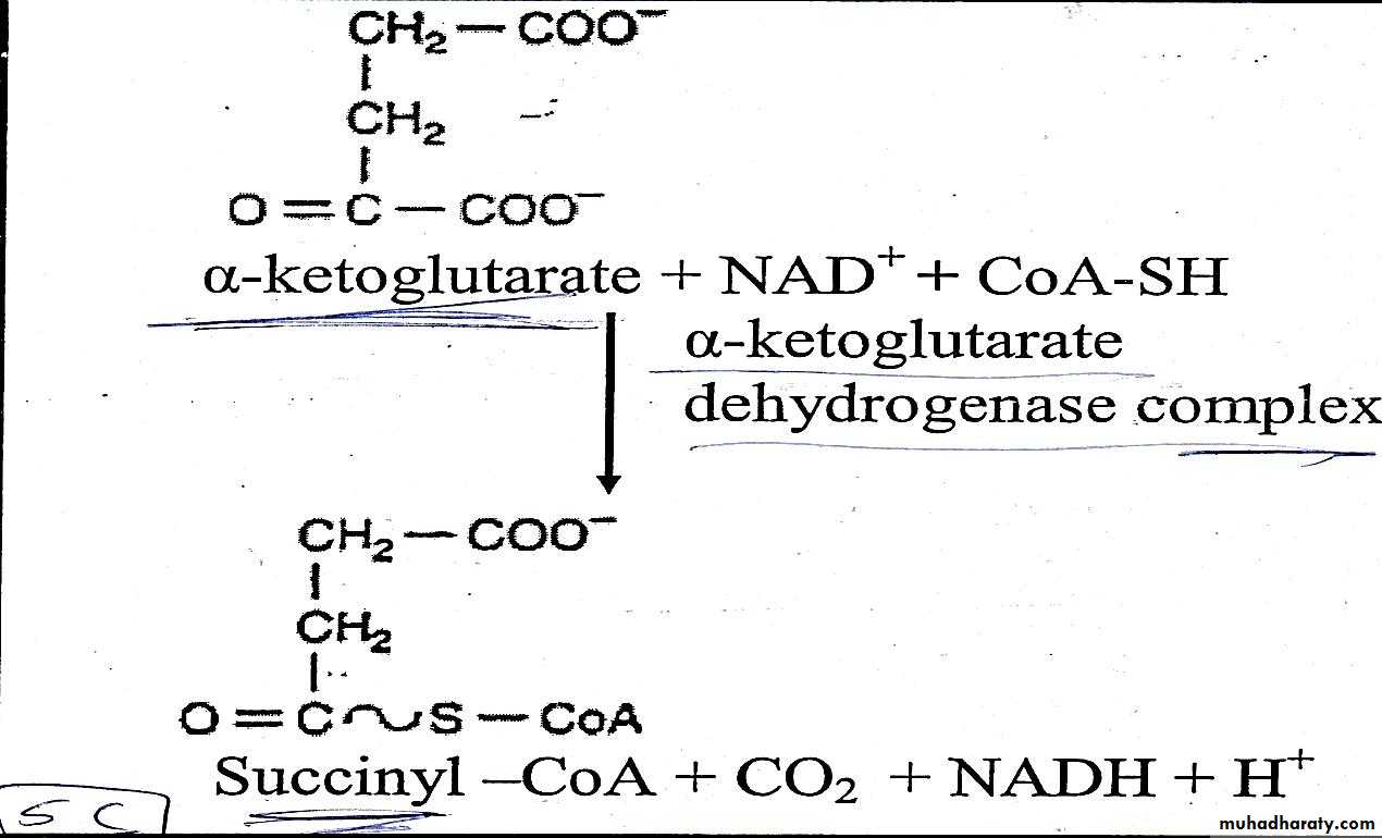Α ketoglutarate undergoes oxidative decarboxylation .this irreversible reaction is catalyzed by α ketoglutarate dehydrogenase complex which require also identical cofactors to that of pyruvate dehydrogenase as thiamin diphosphate and is inhibited by arsenate causing accumulation of α ketoglutarate.In this reaction α ketoglutarate in the presence of NAD˖ and Co A SH result in formation of