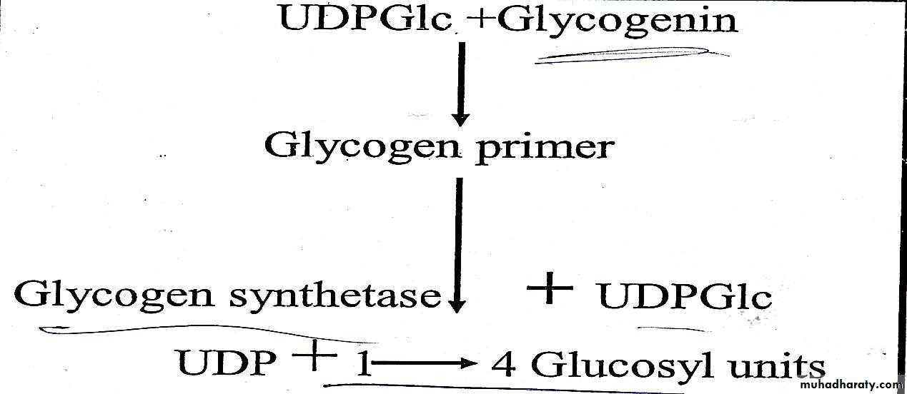 Glycogen synthase catalyzes the formation of glycosidic bond between C1 of active glucose of UDPGlu and C4 of a terminal glucose residue of glycogen primer producing 1→4 glucosyl unit with liberation of uridie diphosphate .therefore, the primer must be present to initiate the glycogen synthesis .this reaction is irreversible.5