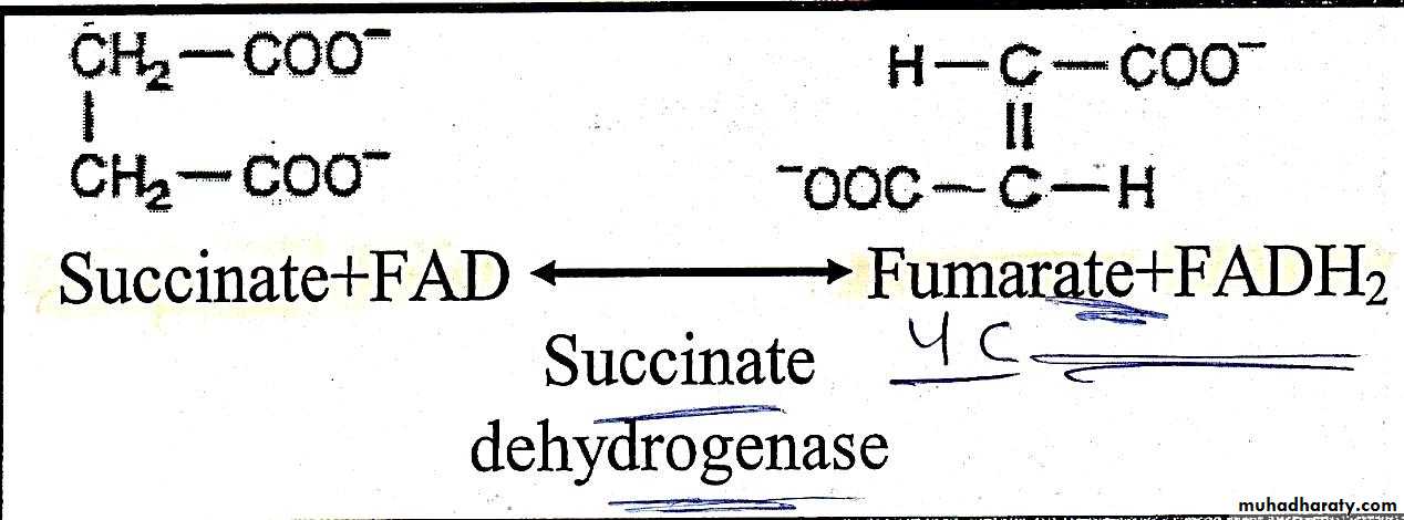 Dehydrogenation of succinate into fumarate by transfer of hydrogen directly from substrate into a flavoprotein,it is the only dehydrogenation reaction in the cycle involving direct transfer of hydrogen from substrate without participation of NAD ,this reversible reaction is catalyzed by succinate dehydrogenase .Reaction 7