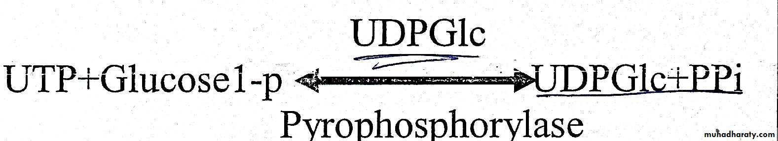 Glucose 1 phosphate reacts with uridine tri phosphate (UDP) to form active nucleoside uridine diphosphate glucose and in organic phosphate this reaction is catalyzed by UDPGlu pyrophosphorylase .Number 4