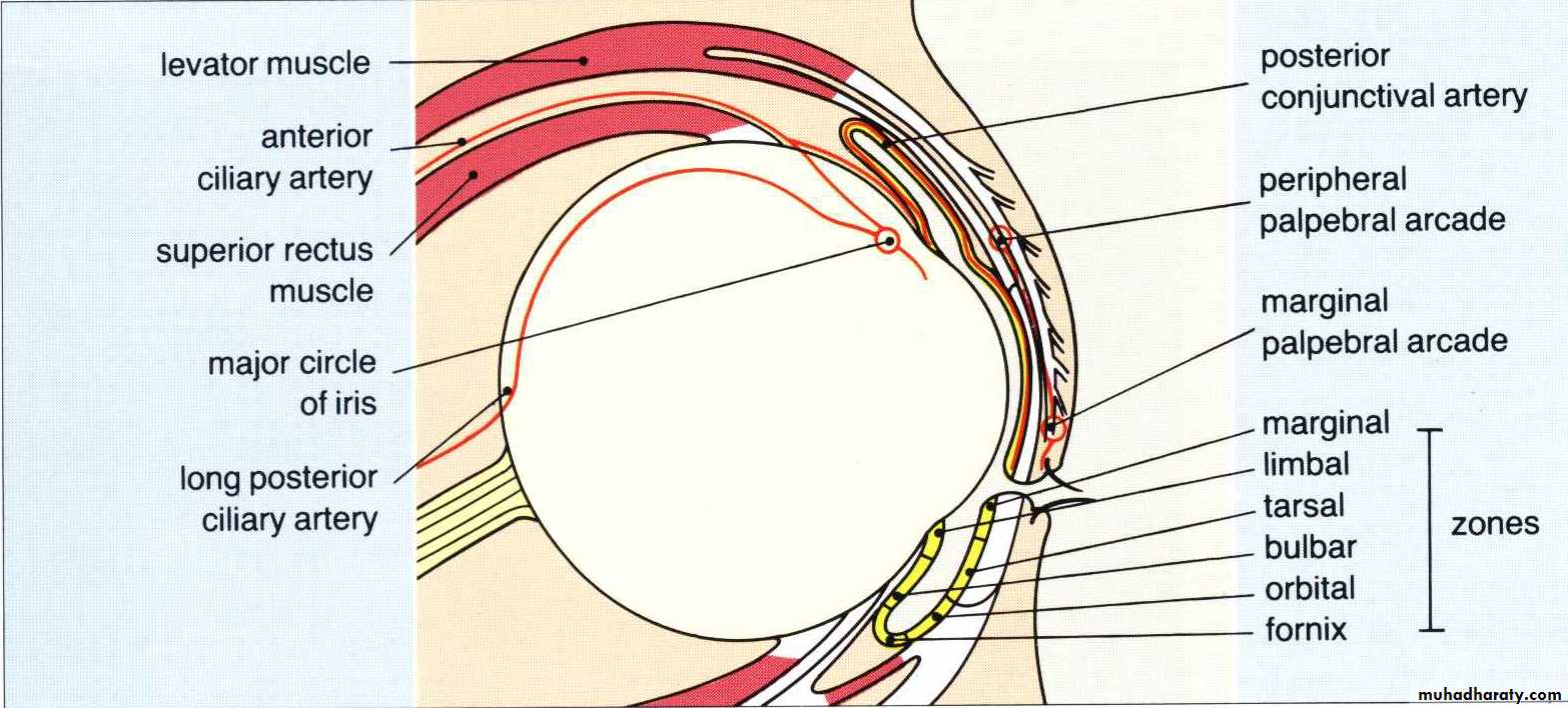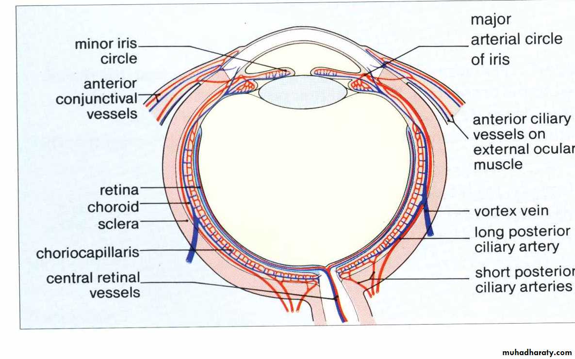 * BLOOD SUPPLY :1. mainly via ophthalmic artery from internal carotid artery.