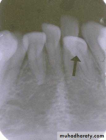The arrow identifies the lingual canal. The tube head moves mesially from the premolar film to the canine film (beam directed more distally) and the gutta percha indicated by the arrow also moves mesially. (See following slide).