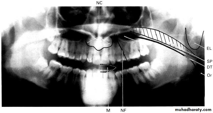 one side of the radiograph, NC — nasal cartilages, EL — ear lobe, SP — soft palate,